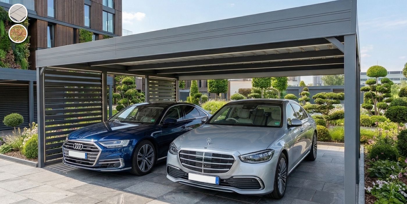 Pulverbeschichtete Flachdachcarports aus Stahl mit vielen Individualisierungsmöglichkeiten, hochwertig verzinkt und endbehandelt nach Palette. Optional auch mit Abstellraum mit Schwing- oder Schiebetür. Hoch tragfähige Konstruktion mit optionalem Gründach bzw. PV-Dach.
